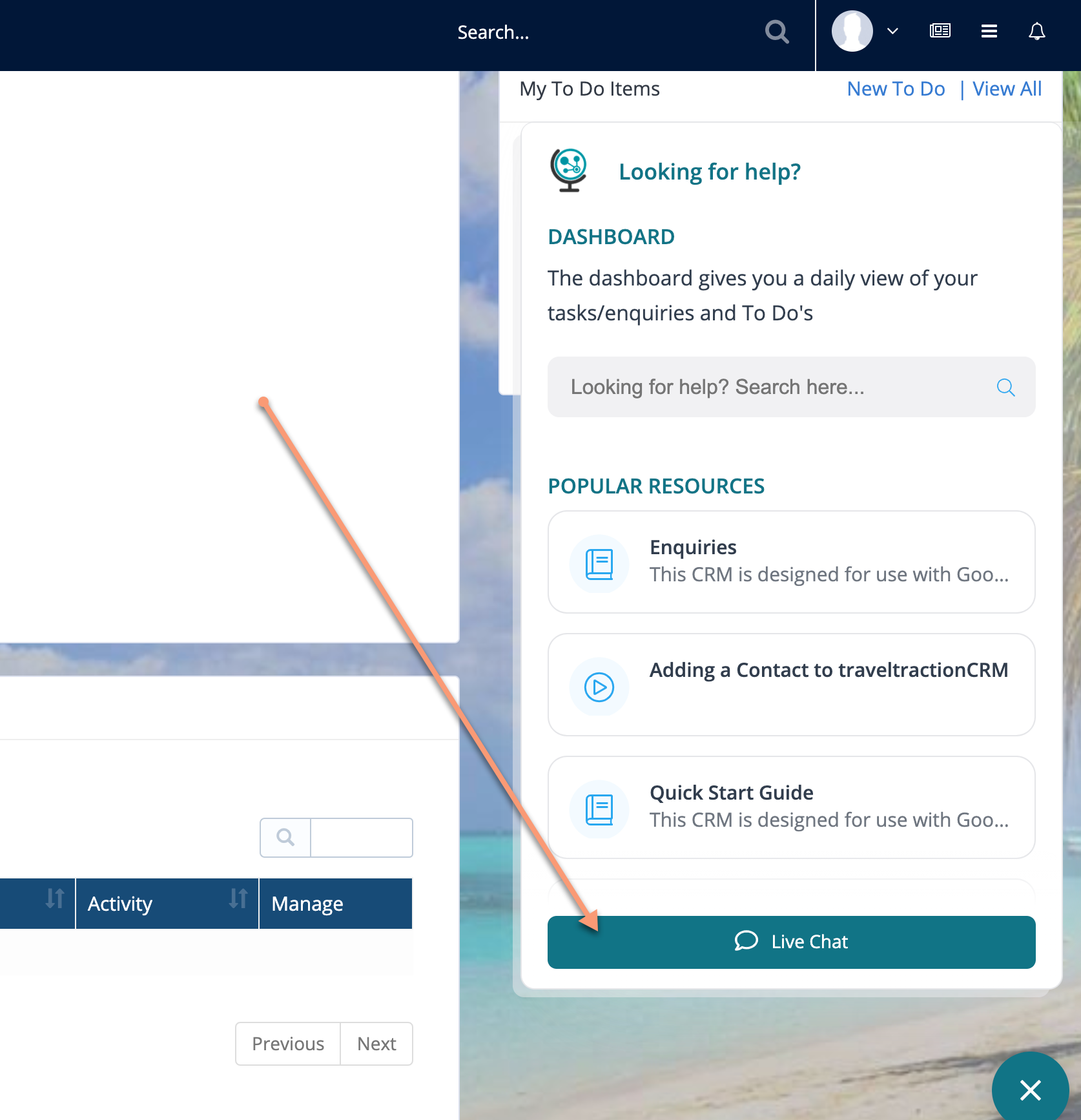 At the bottom of the CRM screen there is a help button to access Help Articles and Live Chat our Support team.